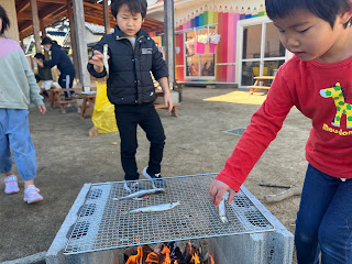 小さいクラスに今日魚焼くけー食べにきてねーーーと意気揚々と伝えていました。